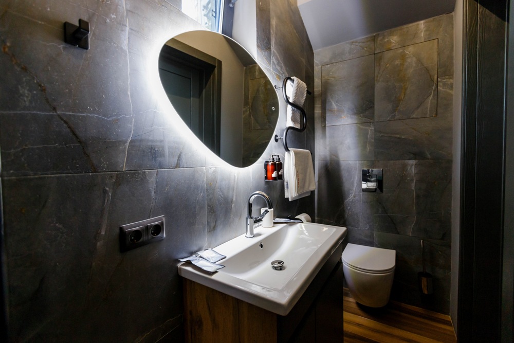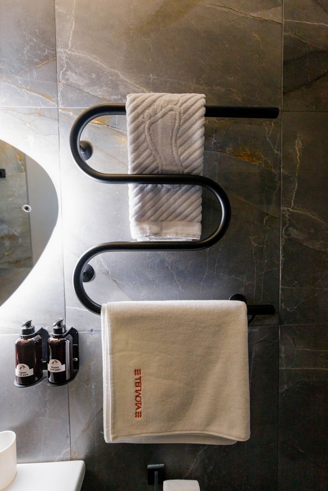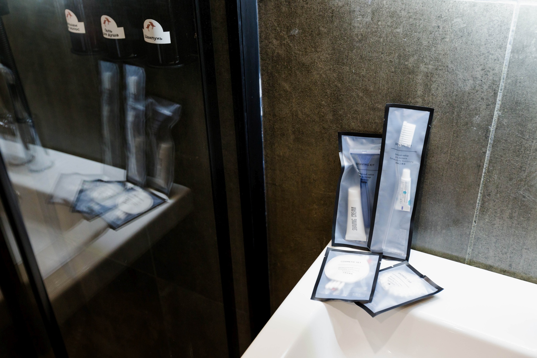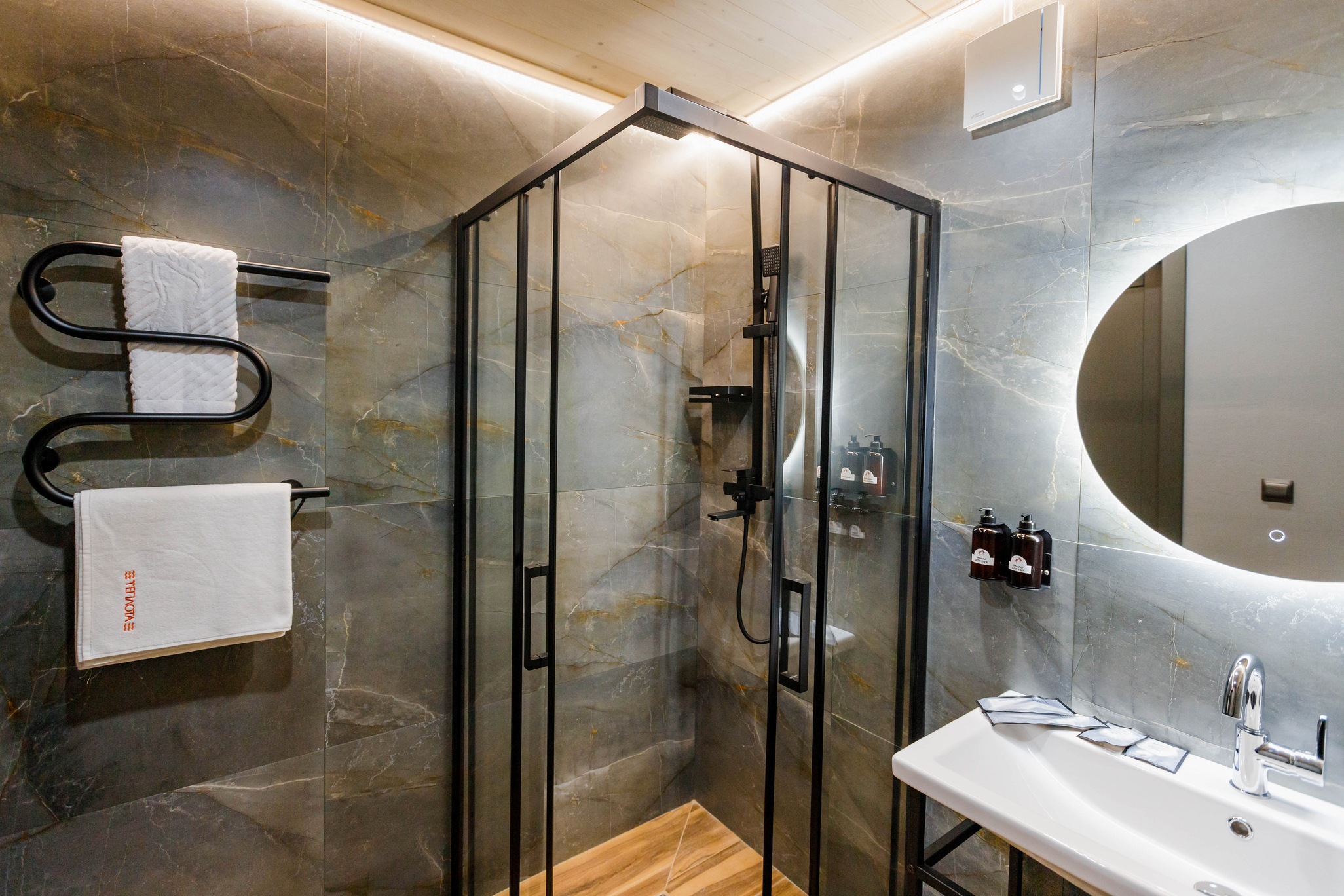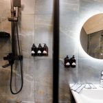 ванная комната с душевой кабиной, фен, набор банных принадлежностей