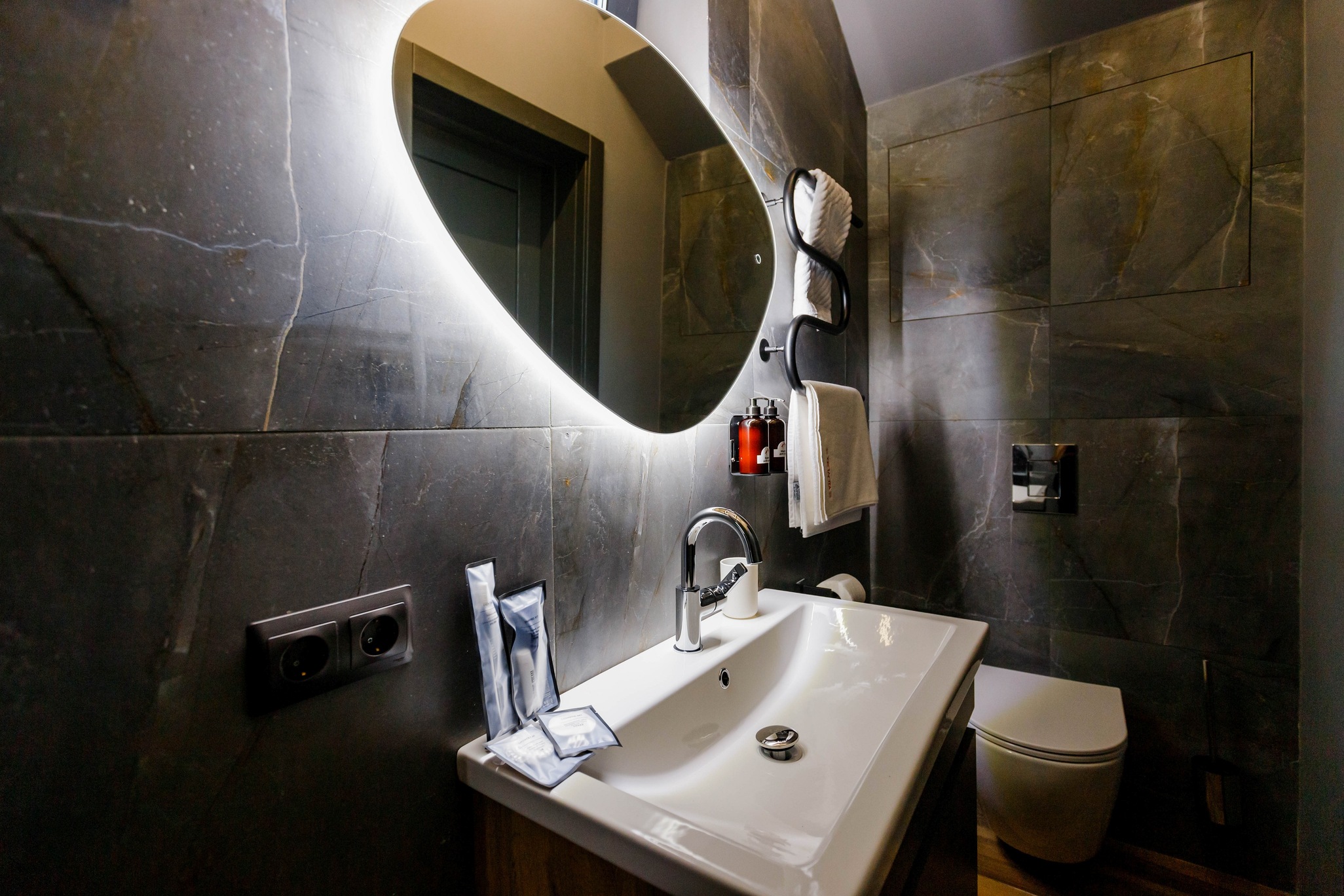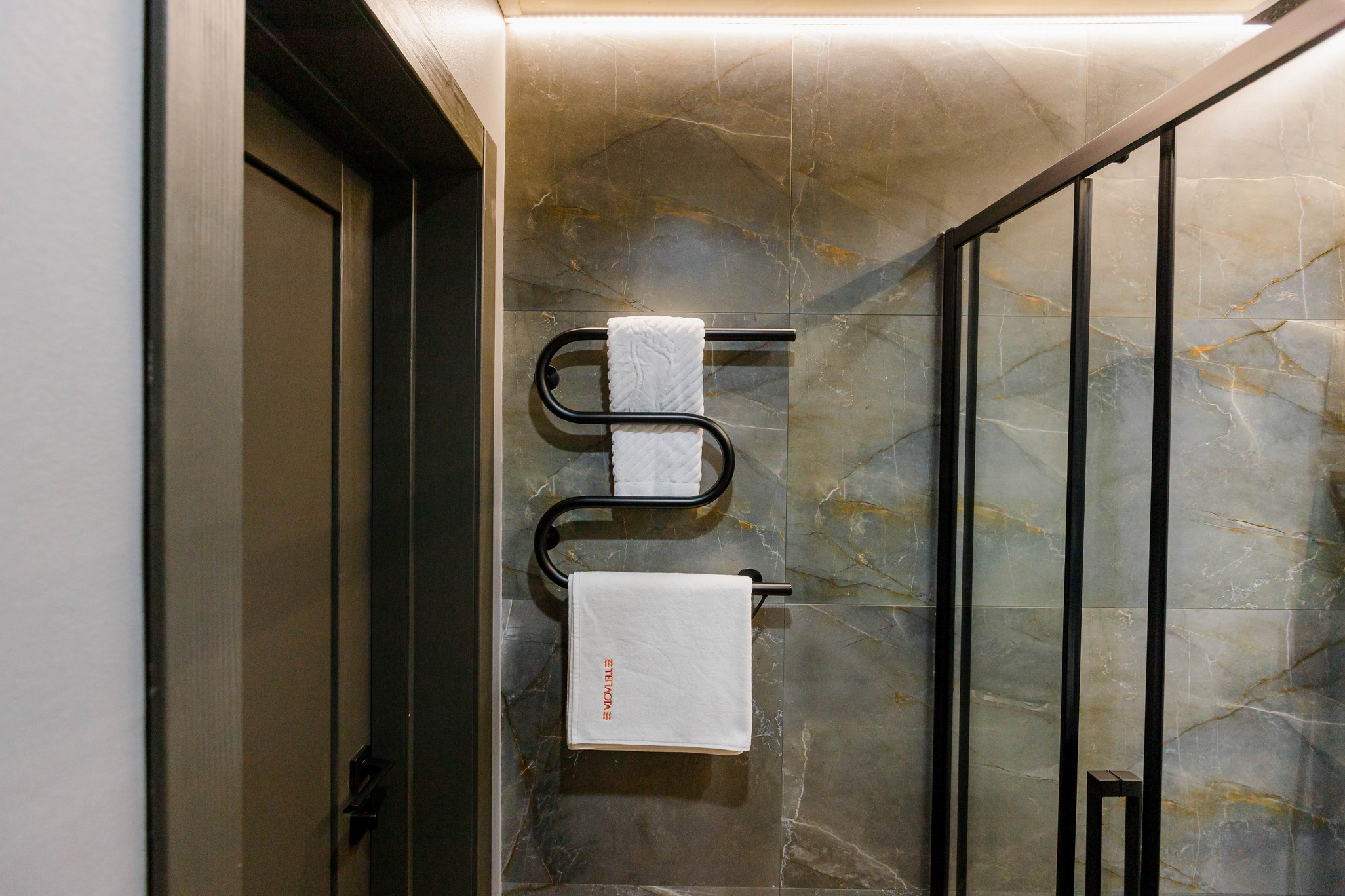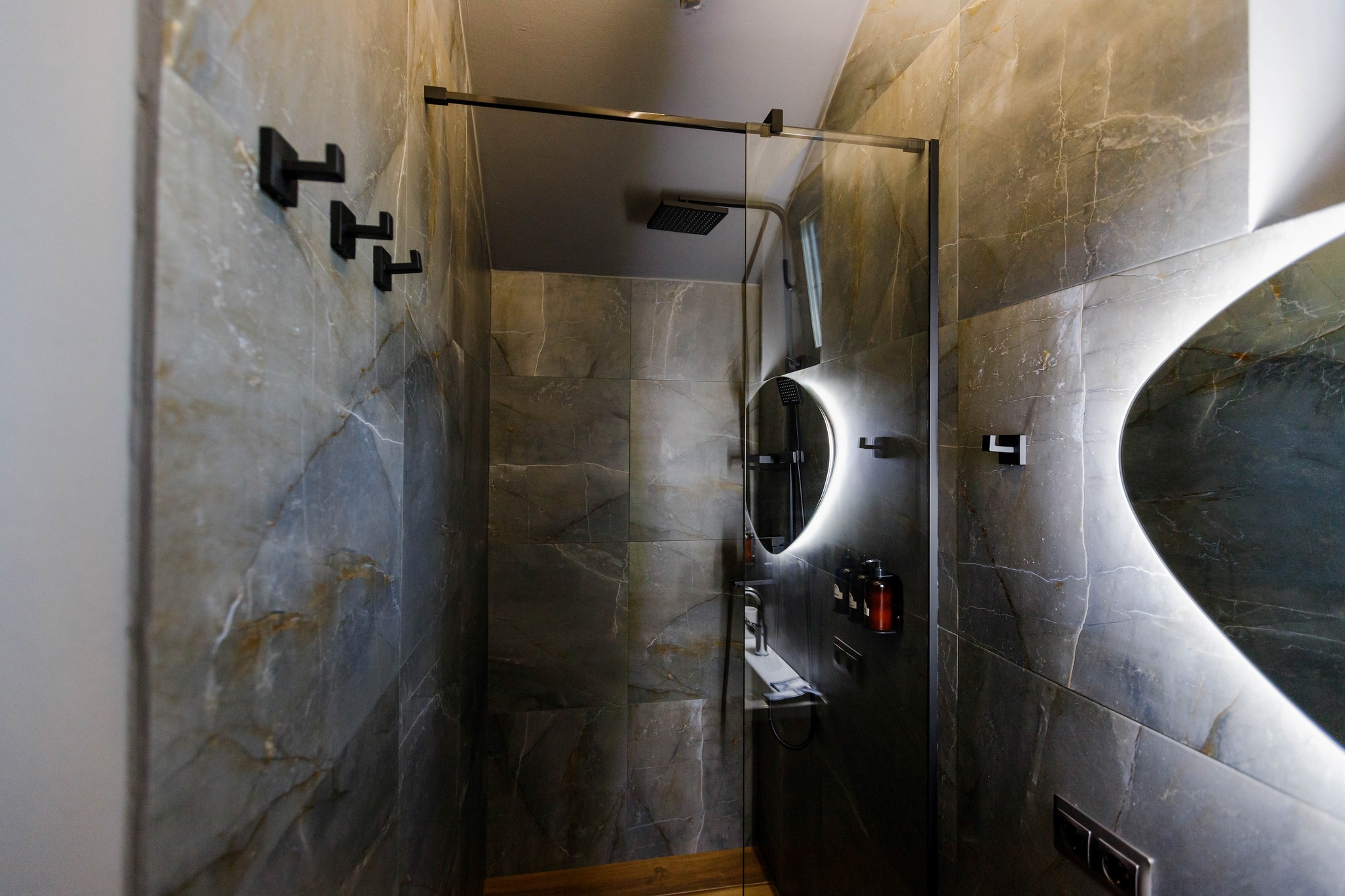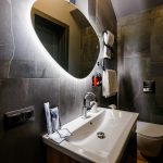 ванная комната с душевой кабиной, фен, набор банных принадлежностей